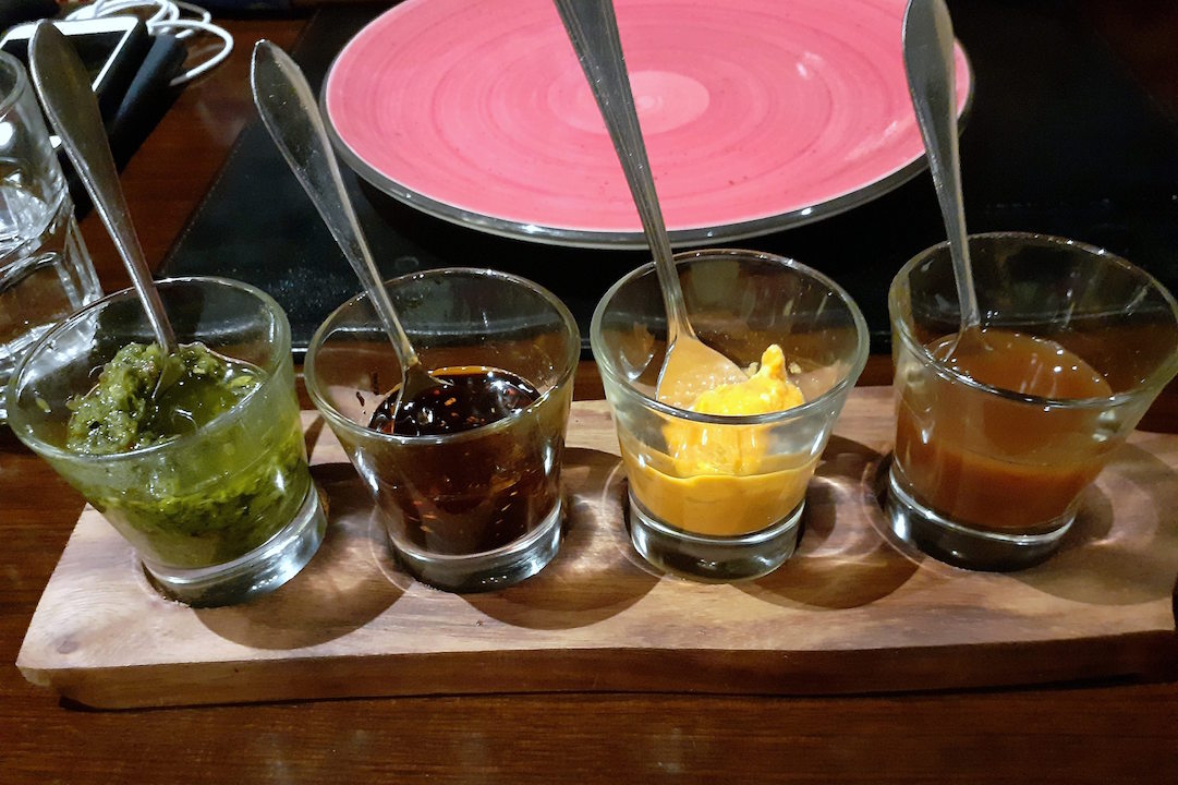 The four sauces for the dim sums- spring onion+ black pepper, scehzwan pepper in chilli oil, spicy onion and tamarind soya sauce tangy