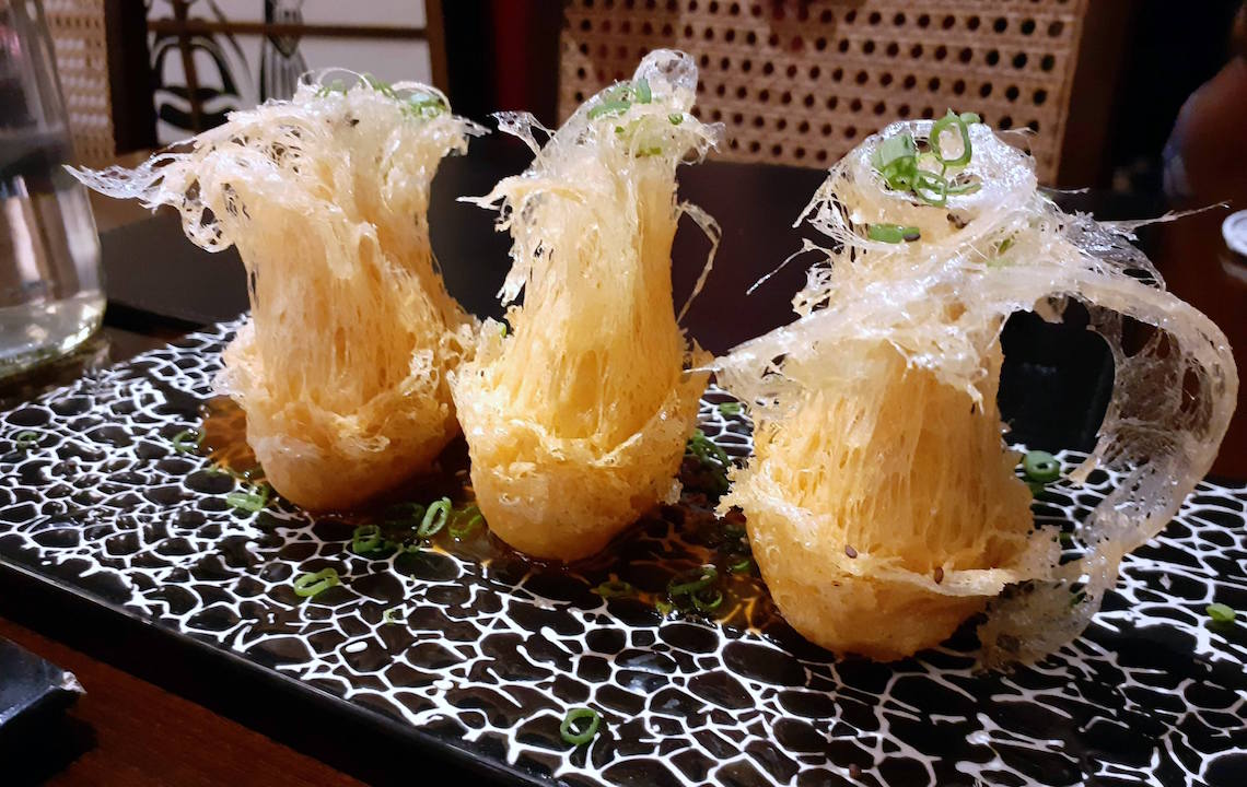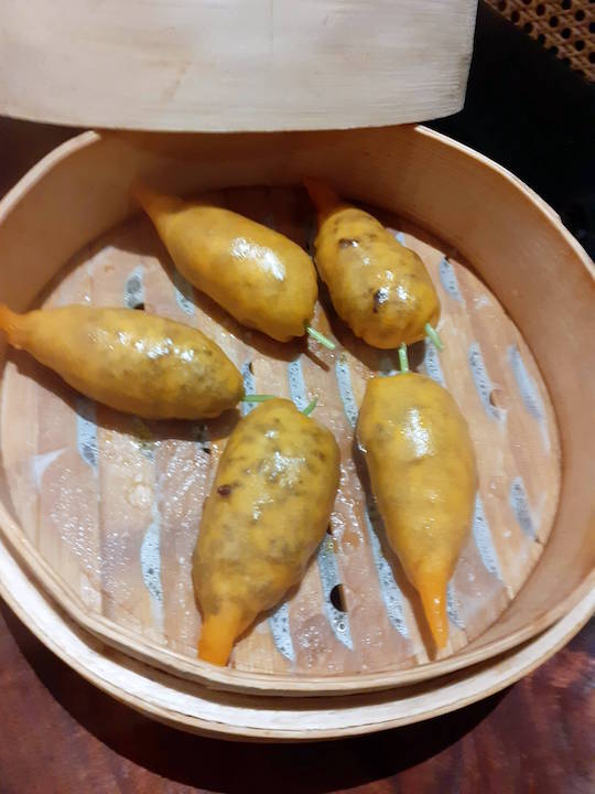 Golden Mixed veg Phoenix tail puff [Fried golden puff +mixed veg]- Oh my gosh, these were out of the world. The outer layer taro puff just melted in our mouths while the filling had us puzzled, was it potato, was it cheese, what was that layer outside the veggies? We did not know for sure, but we loved it..